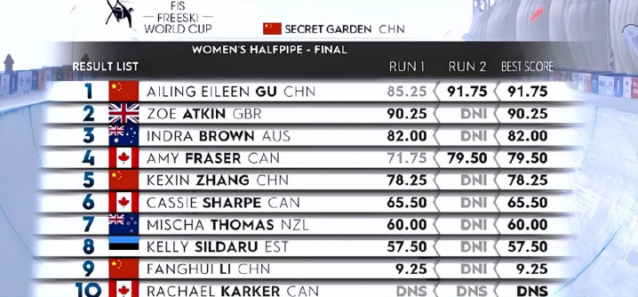 如今在决赛当中,谷爱凌第一轮85.25分暂列第二,逊色于英国选手阿特金的 90.25分。不过谷爱凌凭借第二轮完成左转900Buick抓板、右转900tail等高难度动作,成功收获91.75分,成功实现逆转夺冠,从而实现在云顶站的3连冠。