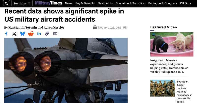 《军事时报》进一步指出,虽然统计数据没有涵盖2025年,但美军今年已发生多起公众反响较大的事故,包括:今年1月,一架陆军直升机与客机在华盛顿上空相撞;春天,在中东执勤的“杜鲁门”号航母损失了两架舰载机;9月,4名陆军特种兵在华盛顿州死于直升机坠毁;10月,“尼米兹”号航母在半小时内连摔两机……